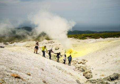 Вы позавтракаете в гостевом доме и отправитесь на фумарольное поле вулкана Менделеева (треккинг — 7 км в обе стороны). Фумаролы — это трещины, из которых громкими выхлопами выходят вулканические газы. Сера в составе газов кристаллизуется и образует на поверхности желтые кружевные узоры. Маршрут проходит через заросли бамбука: растения достигают двух метров в высоту.