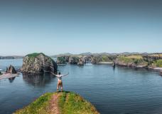 На Кунашире пройдете по скалам к мысу Столбчатому и полюбуетесь водопадами Головнинского клифа