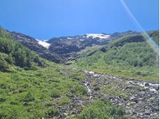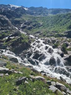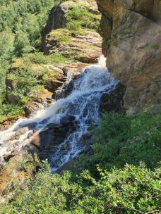 Маршрут с постепенным набором высоты приведет вас в верховья реки Терскол. Отсюда можно близко подобраться к Терскольскому водопаду (высотой 20 метров): вам нужно будет дважды перейти горную реку по узкому деревянному мостику, а затем преодолеть достаточно крутой, но не затяжной подъем по каменистой тропе к подножию водопада. Здесь вы отдохнете и устроите небольшой перекус (сухпаек), а затем вас ждет спуск по тому же маршруту обратно на поляну Чегет.
