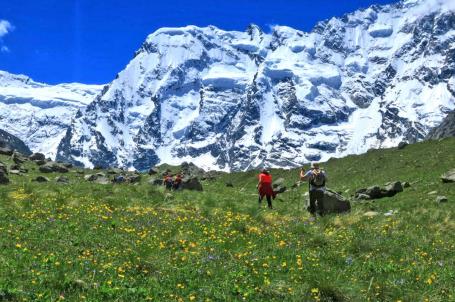 Обед будет организован на природе с видом на заснеженные вершины. Далее, пройдя по цветущим субальпийским лугам, вы окажетесь у ледника Мижирги. На обратном пути пройдете мимо ущелья Теплый Угол, где любят тренироваться альпинисты. Также полюбуетесь каскадным водопадом Гидан — он рождается на горе Гидантау и, прыгая по каменным уступам, устремляется в долину.