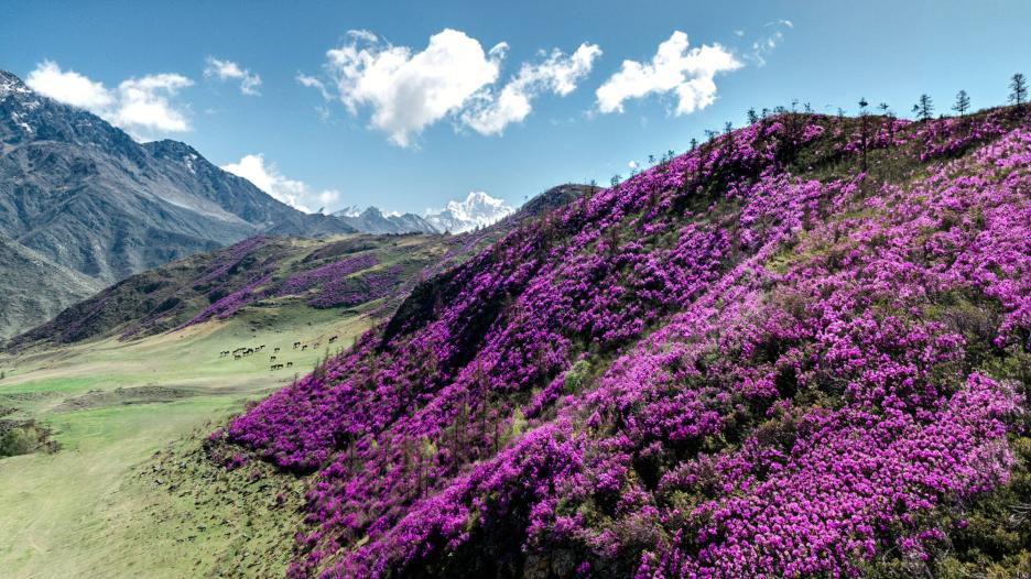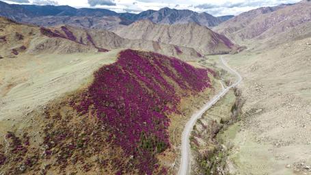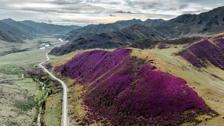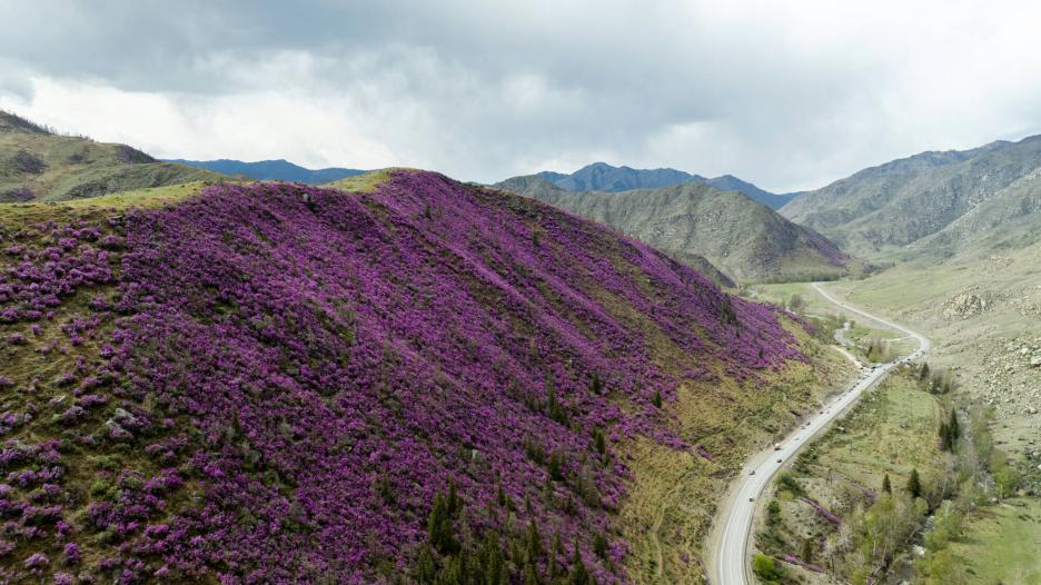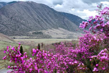 В начале мая в Алтайских горах можно увидеть весь спектр цветов: розово-лиловые кусты, словно одеяло укутавшие склоны, — в центральной части республики Алтай. Бирюзово-голубые горные озера, обрамленные изумрудными берегами, — в восточной. Красно-оранжевые с желтыми и фиолетовыми вкраплениями скалы — на юге.